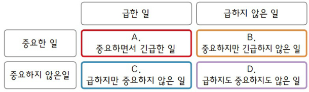 - 긴급하고 중요한 작업: 즉시 해결해야 하는 작업에 우선 순위를 둠